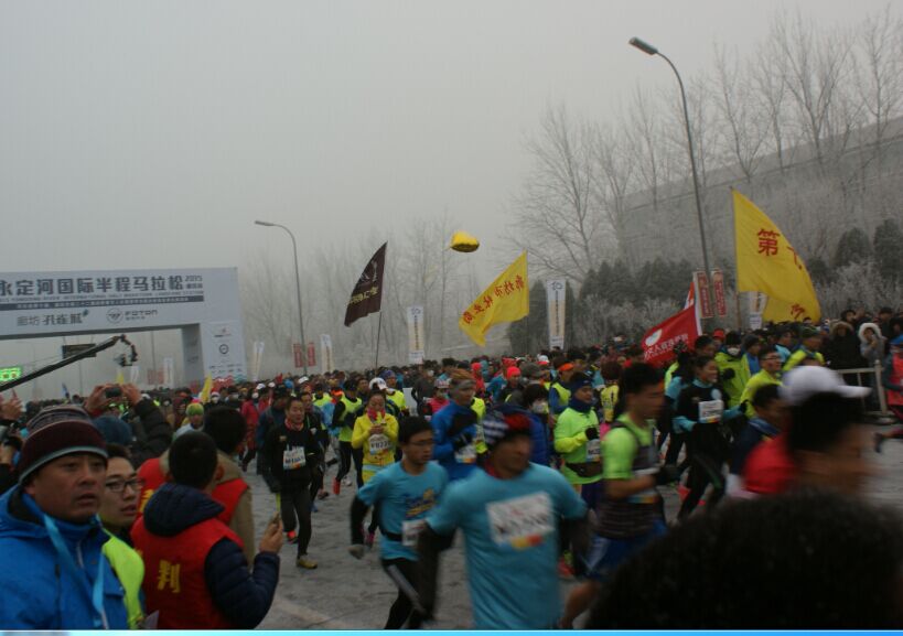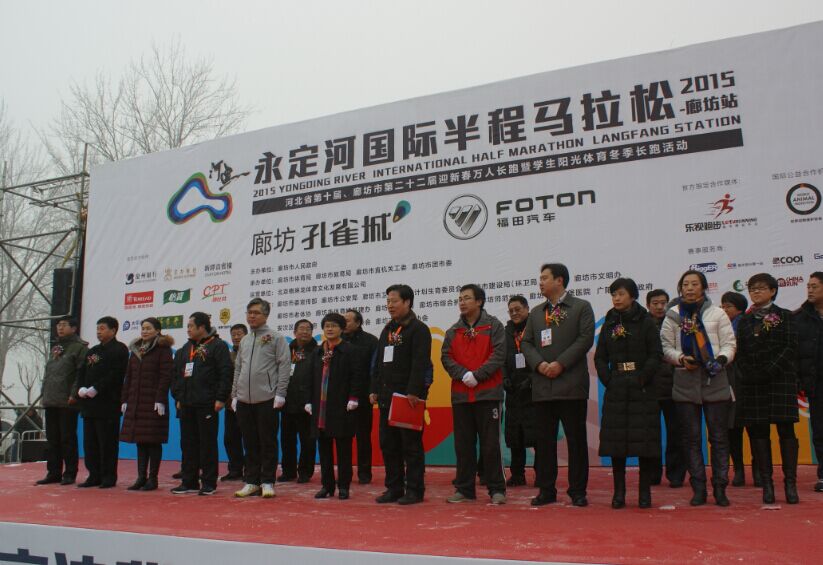、廊坊市委宣传部、廊坊市市直机关工委、廊坊市总工会、廊坊市教育局、北京格琳龙体育文化发展有限公司承办,廊坊市公安局、廊坊市防范办、廊坊市卫生和人口计划生育委员会、廊坊市共青团、廊坊市文明办、廊坊市妇联、廊坊市老体协、廊坊市运动学校、廊坊市体育场基建办、廊坊市供电局、廊坊市卫生局、安次区人民政府、广阳区人民政府、开发区管委会协办的2015年迎新春万人长跑暨永定河国际马拉松比赛开跑。共有来自国内知名跑团、跑步爱好者、国外马拉松选手和市直、区直机关、中省直各单位、各企事业单位职工及大中专院校、中小学生近万人齐聚这里,以参加长跑,追求健康的生活方式共同迈向新的一年。