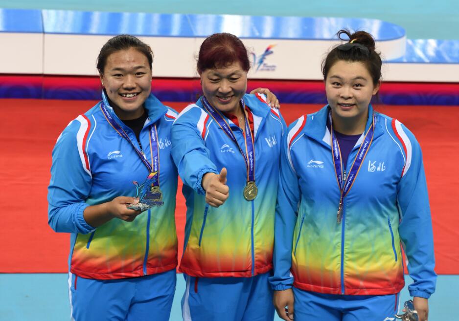 苏欣悦(左)、教练肖艳玲(中)、陈扬(右)