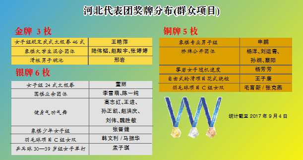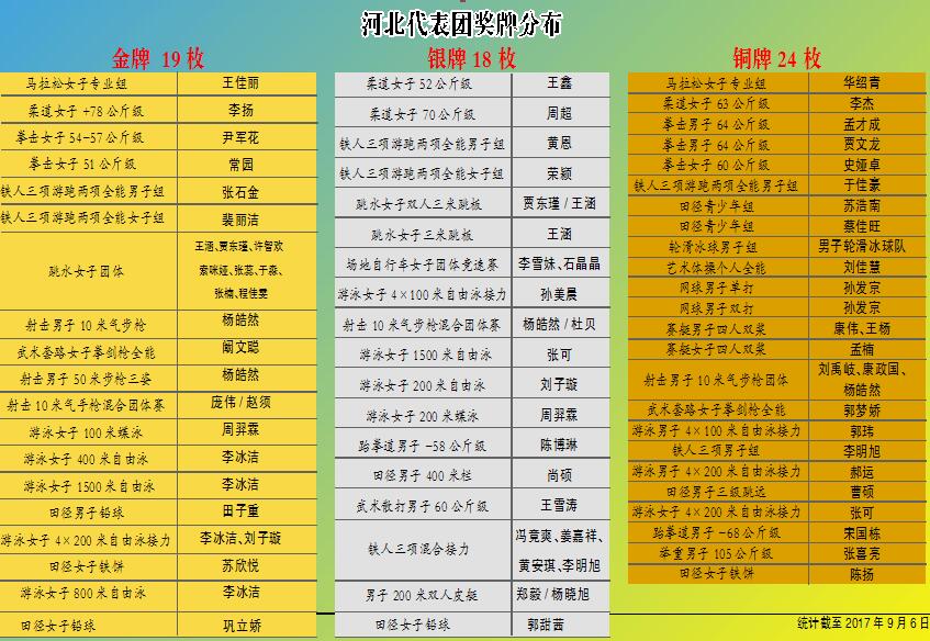 截止到9月6日 全运会河北代表团奖牌分布表